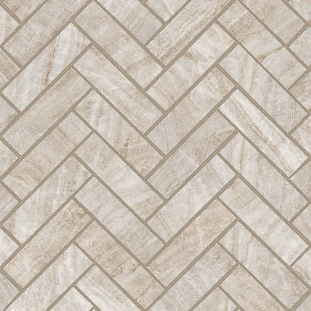 Bedrosians Magnifica Era Luxury 12" x 12" Satin Porcelain 1x4" Herringbone Mosaic delivers a chic and timeless design element to your interiors. The herringbone pattern adds texture and visual interest, making it perfect for backsplashes and feature walls. With its satin finish, this mosaic tile offers a refined look that enhances any space without overwhelming it. Ideal for both residential and commercial applications, Bedrosians Magnifica Era Luxury mosaics combine beauty and functionality for a truly stunning result.