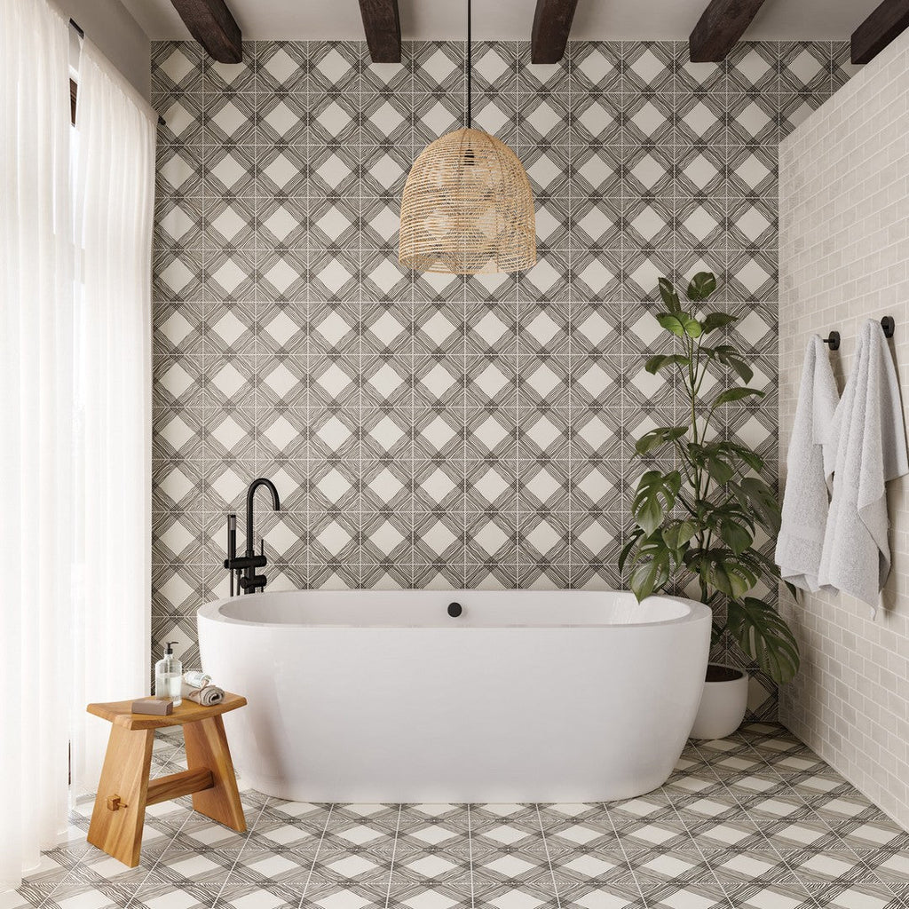 Step into Rothko's world, where boundless creativity takes the lead! Engineered to bring playful, daring, and modern patterns to your living spaces, these 9x9 ceramic tiles in black and white offer versatility with options in both solid and patterned designs. With their unique 3rd fire raised glaze, these tiles provide a textured surface, adding depth and dimension to any room.