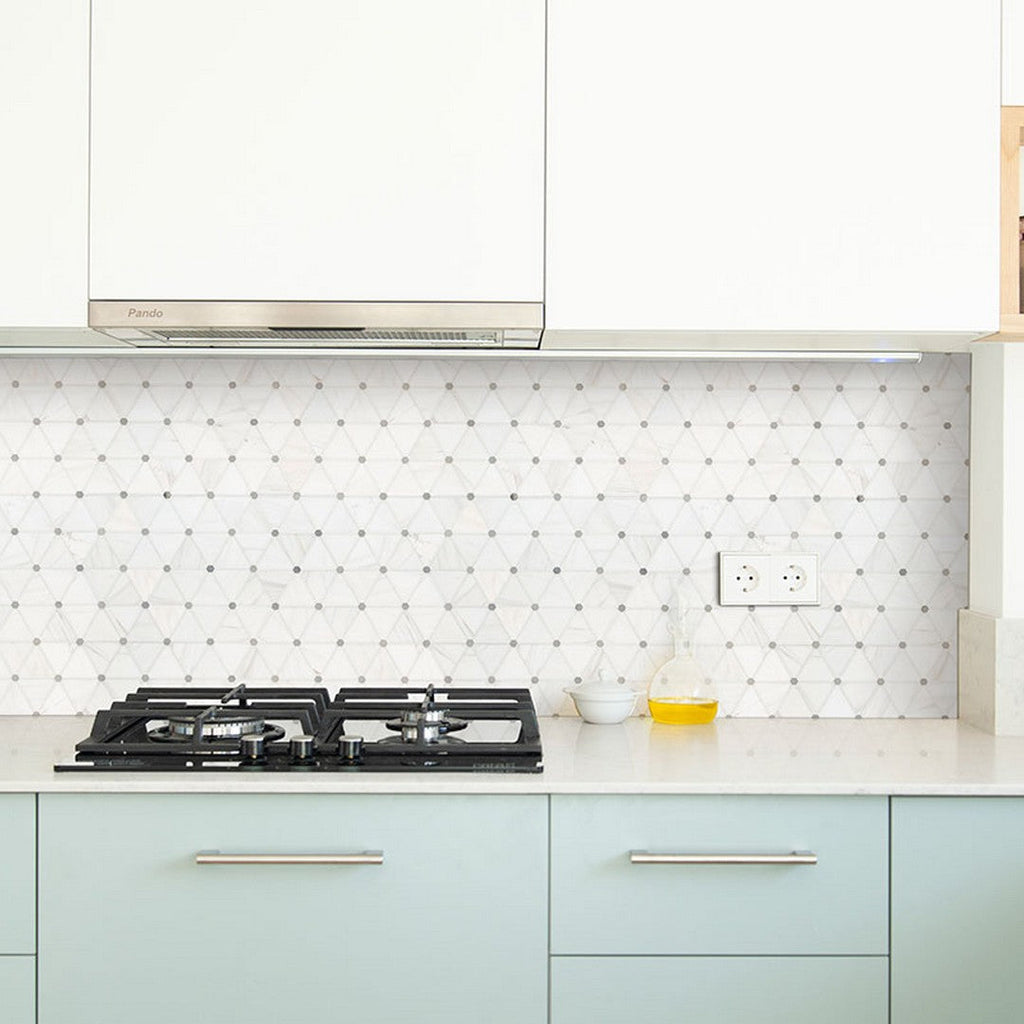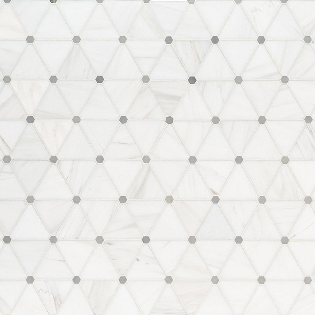 Bianco Dolomite Pinwheel Tile features geometric tiles in timeless marble but with a fun and contemporary pinwheel design. The natural stone in white with gray accents and a pretty polished finish of this backsplash tile is recommended for geometric floor tiles, countertops, shower surrounds, and patterned wall tiles.